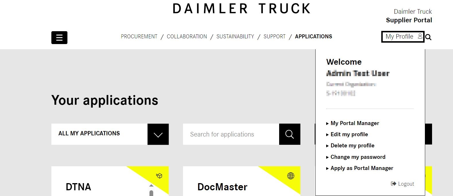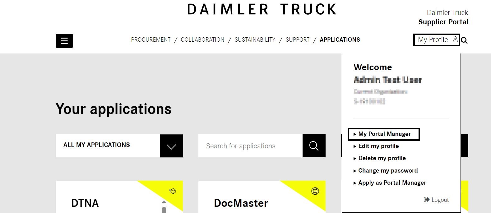 Log in to the Daimler Truck Supplier Portal and click on the "My Profile" in the upper right corner and then on "My Portal Manager".