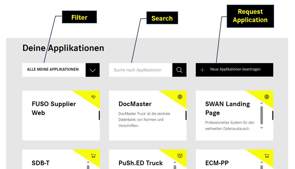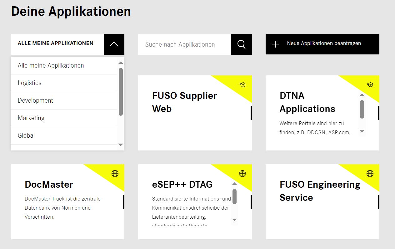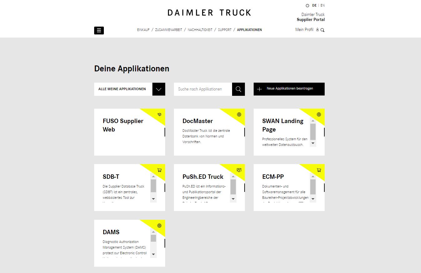 Das Supplier Portal ist eine Plattform, auf der Sie auf einzelne Apps der Daimler Truck AG zugreifen können. Wenn Sie eine App öffnen, verlassen Sie die Plattform, bewegen sich aber weiterhin im Daimler Trucks Netzwerk.
